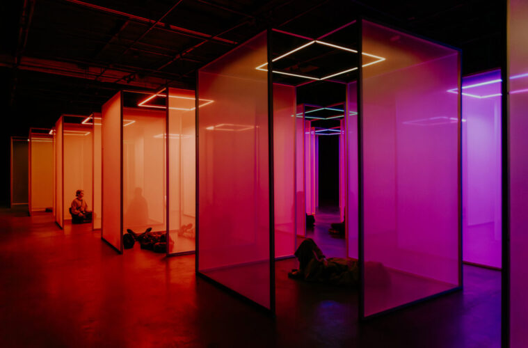 Upon being welcomed into the exhibit, guests enter a dark ambient space to attune to their senses. Afterward, they enter the Field, a vibrant light and sound constellation composed of repeating translucent scrims that create a series of open and interstitial spaces. In the multi-layered experiential environment, each of the 21 nodes is activated by a single source of light and spatialized sound. As guests are invited to wander through and around the nodes freely, a proprietary technology, Chromasonic Refrequencing, translates sound frequencies to light and light frequencies to sound in real time, making light audible and sound visible.