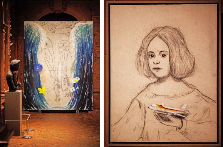 Other elements of the installation: at the far end of the room, a careworn, mournful wooden sculpture of a boy holds the notebook, its 50-year-old cover image staring across the expanse of painted ocean and the passage of time at the original, with whom it too has been reunited; four small paintings by Martínez Celaya based on Little Girl, augmented with young Enrique’s objects of desire, such as a balloon, new socks, and the plane that took his father away and could take Enrique to meet him; a canopy of light projections of items from the notebook illuminating the ceiling; and garlands of paper boats made by students in his childhood town of Nueva Paz. As well, a thoughtful selection of early-20th-century works from the permanent collection — by Goya, Miguel Viladrich Vilá, Eugenio Hermoso Martínez, and others — line the vestibule, delivering on the promised engagement and offering a charming art historical potpourri that reinforces the enduring themes of children, families, and migration in art history.